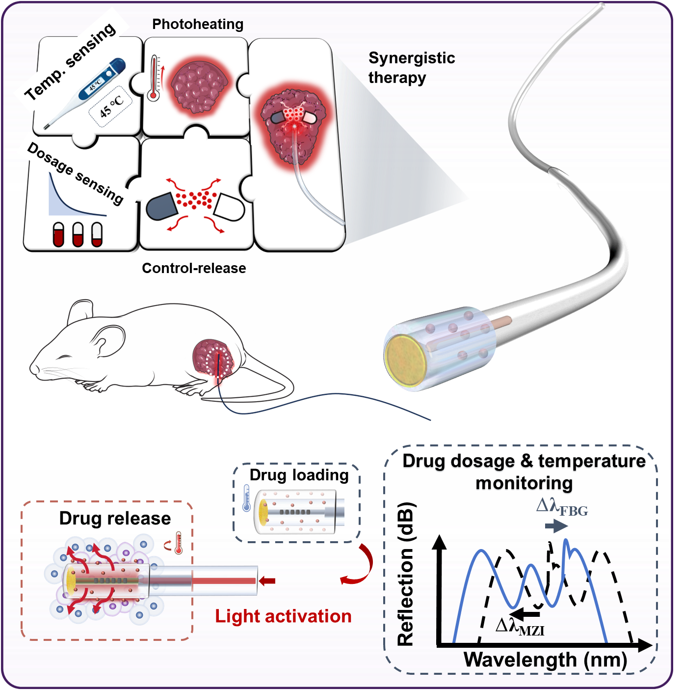 图1.基于光纤光控药物释放的肿瘤光热化疗协同治疗策略示意图