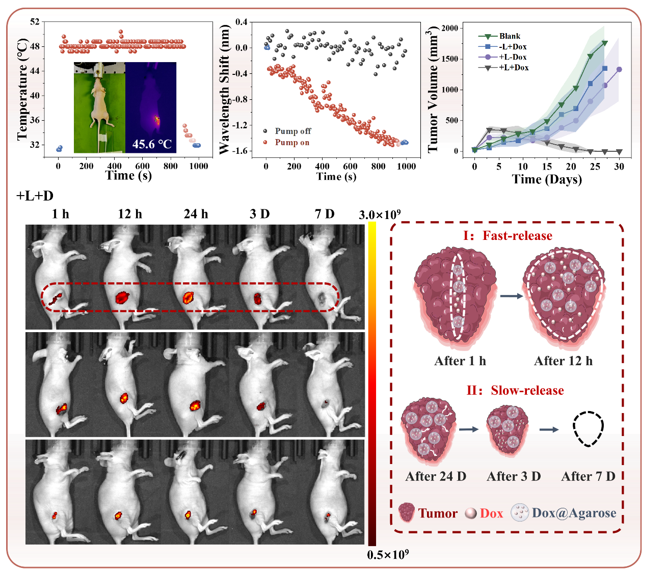 针对上述难题,团队以光纤作为药物递送载体,利用生物可降解的温控相变琼脂糖水凝胶将抗肿瘤药物包裹于光纤表面,通过光纤介入的方法直接将药物递送到肿瘤病灶,在病灶处通过光纤光热效应引发凝胶相变实现药物的原位释放,如图1所示。该方案不仅不受光学穿透深度的限制,而且避免了传统化疗方式药物经体循环带来的代谢损失和生物毒性。利用肿瘤组织的热耐受能力较差以及热刺激下微环境变化等特点,该方案对肿瘤部位的光热效应不仅可以直接杀伤肿瘤细胞,还能增加肿瘤组织的通透性,促进肿瘤组织对药物的吸收,巧妙地实现了光热化疗协同治疗。