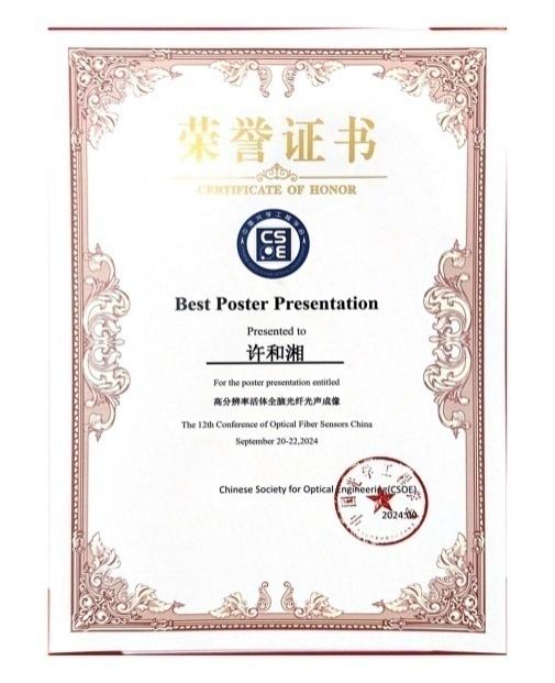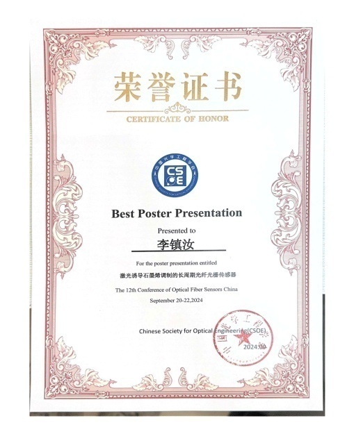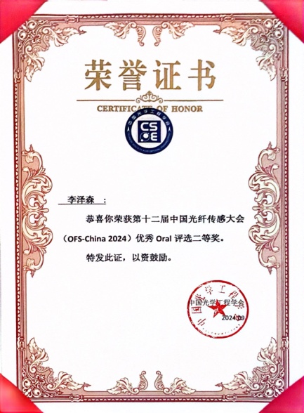 此次会议颁发了第一届光纤传感优秀青年人才奖,学院关柏鸥团队冉洋研究员是全国6位获奖者之一。