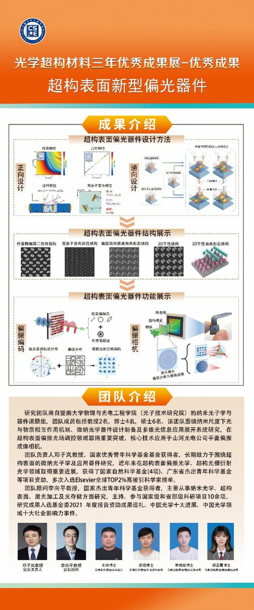9月7日-9日,中国光学工程学会公布“光学超构材料三年优秀成果展”入选名单。喜漫漫画 光子技术研究院超构表面微纳光子器件课题组(邓子岚、李向平、王帅、史坦、李枫竣、胡孟霞)的系列成果——超构表面新型偏光器件,被评为“设计与制造类”优秀成果,充分展现了团队在微纳光学领域的创新能力与技术突破。