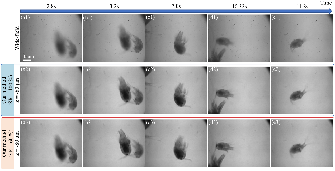 图5.动态桡足样品的成像结果。(a1-e1)传统的宽场显微术;(a2-e2)采样率为100%时采用本文方法获取的结果;(a3-e3)采样率60%时采用本文方法获取的结果