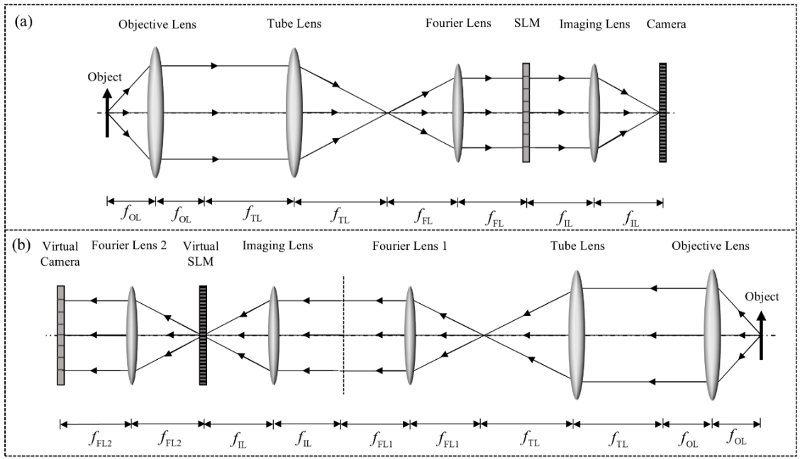 图2.差分高速孔径编码光场显微成像的原理示意图。(a)主成像光路;(b)对偶成像光路
