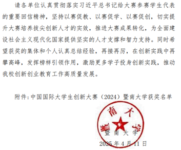 4月11日,学校发布《喜漫漫画 关于表彰中国国[国际大学生创新大赛(2024)参赛组织和个人的决定》(教〔2025〕22号),表彰在本次比赛中获奖的组织和个人。