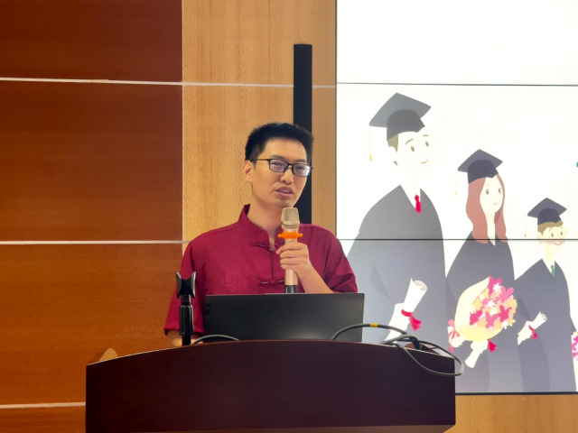 教师代表、2021级光电A班班主任张鸣杰分享了班级同学四年在校期间的“独家记忆”,并祝愿全体毕业生们带着在暨南园所的知识与技能,在未来的道路上勇于探索,努力成为光电领域的中流砥柱。