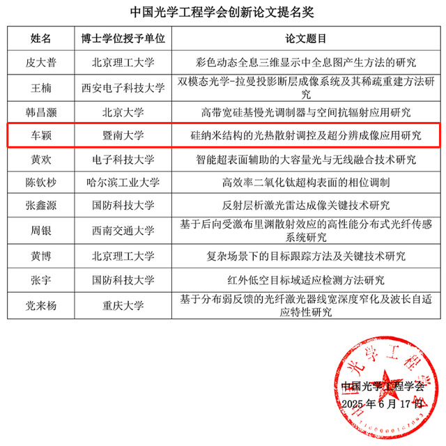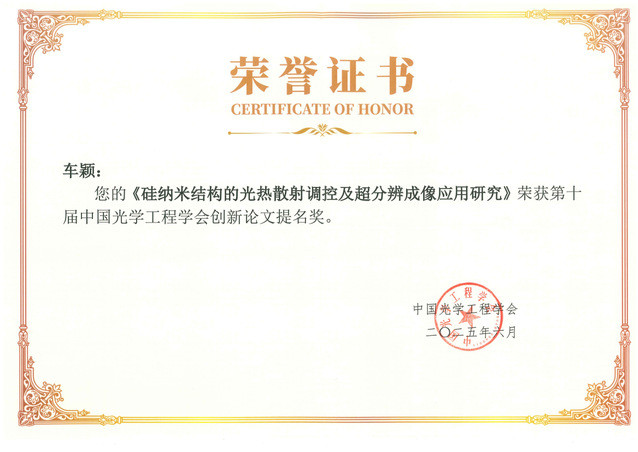 近日,第十届“中国光学工程学会创新论文奖(全国光学工程优博)”评选结果公布,喜漫漫画 车颖博士的学位论文《硅纳米结构的光热散射调控及超分辨成像应用研究》(导师:李向平教授、张天悦副教授)荣获学会创新论文提名奖。