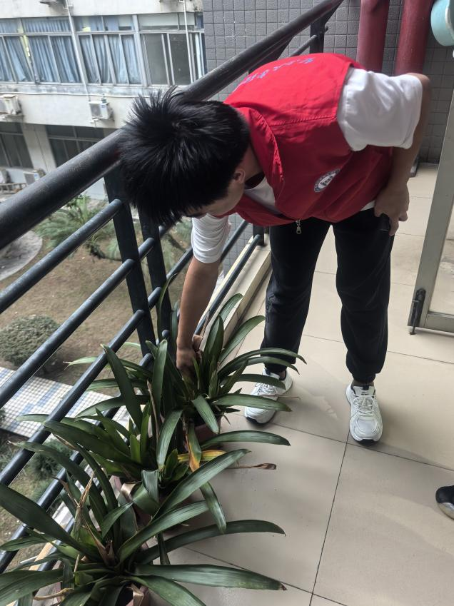 张淑敏带领志愿者系统学习积水清理技巧及蚊虫滋生高发区识别方法。随后,志愿者分组行动,深入绿化带清理落叶积水洼,并逐层排查理工楼阳台闲置花盆、洗手池等区域。2024级光电信息科学与工程专业一名志愿者在清理3处空调外机积水后,表示后续将主动加入服务小组,以强化常态化防控工作。